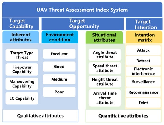 In the context of single-point area air defense, the assets protected by air defense units are clearly defined and fixed. Therefore, in such air defense scenarios, there is no need to consider the importance of the defended assets. Instead, it is sufficient to evaluate the threat levels of air attack targets based on the parameters provided by the air defense reconnaissance system. The general framework for threat assessment involves extracting and quantifying the threat attributes associated with a target and then deriving relevant threat values. Selecting appropriate threat attributes constitutes the first critical step in this process. During target threat assessment, evaluation attributes directly influence the assessment results. Generally, a greater number of attributes implies richer information coverage and more accurate results. However, an excessive number of indicators may lead to redundant information, increased computational complexity, and potential conflicts between indicators. Given the real-time requirements of air defense systems, the selection of target threat attributes should be carefully controlled to avoid unnecessary complexity. Based on an extensive literature review, this paper concludes that the threat posed by UAVs in combat environments should be assessed from three key aspects: target capability, target intention, and target opportunity.