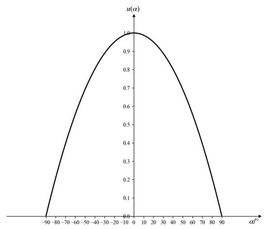 The target’s entry angle reflects its flight direction relative to the defended asset, specifically the angle between the target’s trajectory and the extended line connecting the target to the defended asset. When the target attacks the defended asset, its flight direction must point toward the asset side. A larger entry angle indicates a more evident attack intention; as this angle decreases, the threat level gradually diminishes. When the angle equals 0, it signifies that the target is moving away from the defended asset, at which point the threat value becomes zero. The membership function for the entry-angle-based threat assessment is established as shown in Figure 3, with the corresponding mathematical expression provided below: