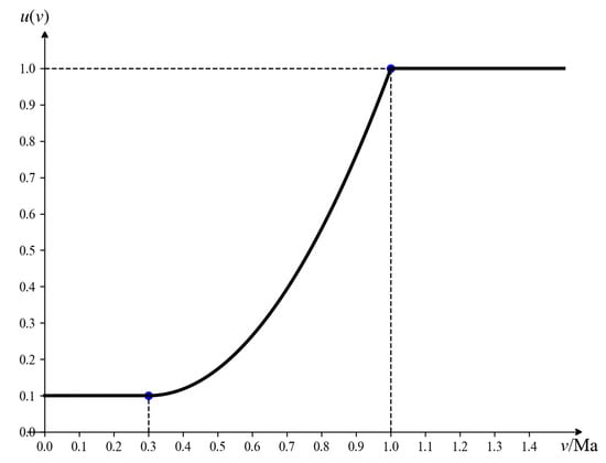 In general, the faster an incoming target flies, the more challenging it becomes to intercept, and the greater the threat posed to the defense position. Focusing solely on target speed, fixed-wing UAVs typically fly faster than rotary-wing UAVs. Currently, operational fixed-wing UAVs can reach speeds of approximately 1 Mach. If a UAV’s speed exceeds 1 Mach, its penetration and high-speed maneuverability are significantly enhanced, posing a substantial threat with a quantified threat value of 1. Conversely, if the UAV’s speed is below 0.3 Mach, it becomes easier for the defense system to detect and intercept it, allowing traditional air defense systems to handle it effectively, resulting in a lower threat level with a quantified threat value of 0.1. Given the fluctuations in the target’s flight state, representing the UAV’s speed using interval numbers improves the robustness and fault tolerance of threat assessment. A rising piecewise function is employed to construct the membership function for speed-related threats, as illustrated in Figure 4. When the input interval is provided, the corresponding mathematical expression of is as follows: