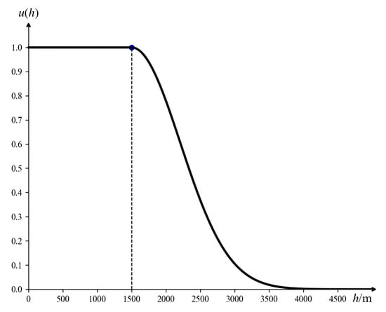 The lower the height of the incoming target, the easier it is to avoid radar detection and the more direct the attack on the defense asset becomes. Consequently, as the target height decreases, its threat level progressively increases. Given potential errors in data collection, interval numbers are employed to represent the uncertainty in height. The membership function for the threat associated with target height is established, as shown in Figure 5. When the input interval is provided, the corresponding mathematical expression of is as follows: