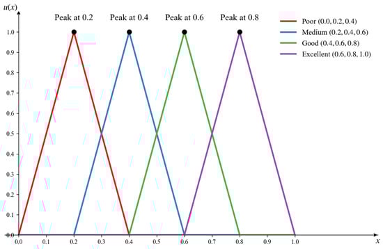 The battlefield environment is one of the critical factors affecting the performance of combat effectiveness. Given its significant complexity, it is challenging to describe the battlefield environment using precise numerical values. However, during specific combat operations, factors such as combat location and meteorological conditions tend to remain relatively stable, allowing for the determination of a relative range for the environmental condition attribute. Consequently, the battlefield environment condition can be categorized into four levels: excellent, good, medium, and poor. To quantify the inherent uncertainty in these environmental indicators, triangular fuzzy numbers are employed. The membership function for environmental threat is established, as depicted in Figure 7. When the environmental condition corresponds to the poor level, the corresponding mathematical expression is provided below, with analogous expressions applicable to the other levels.