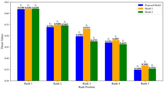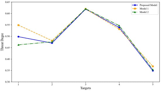 Furthermore, analyzing the bar charts in Figure 10 reveals that the threat degrees of the five targets obtained by Model 1, which neglects target intention fusion, are universally higher than the proposed model and Model 2 (which does not integrate multi-time data). We hold that the inflated threat levels in Model 1 arise because it does not dynamically adjust the weights of attributes according to the target’s varying intentions, resulting in an unreasonable assessment. Conversely, models that incorporate the target’s intentions can effectively align with the dynamic nature of the target, fully leverage available information, and produce more accurate and reliable threat level results.