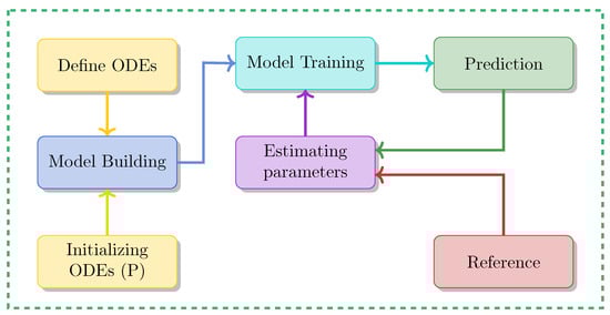 - Initial Parameter Estimation: In this step, the ordinary differential equation (ODE) is defined, with representing the parameters to be estimated and initialized as . The loss function is formulated to minimize the error between the observed data and the values predicted by the model.In Step 3, the PINN model is defined by constructing a neural network to approximate the solution of the dynamical system governed by the ODE. The architecture of the network includes an input layer representing t (the time or independent variable), followed by hidden layers with a specified number of layers and neurons per layer (for example, two layers with 100 units each). The activation function is selected from appropriate options such as GELU or Tanh. Finally, the output layer of the network provides , the approximated state or dependent variable of the system.In Step 4, the model parameters, including the network parameters (e.g., weights, biases) and dynamical system parameters, are optimized through training. An optimizer like Adam or SGD is used to minimize the total loss , adjusting both sets of parameters to reduce the error between predictions and actual values. Gradients are computed via backpropagation, and the parameters are updated accordingly. Training continues until the loss converges, signaling that the model has reached an optimal state.In Step 5: Evaluating the Model, the goal is to assess how well the model’s predictions match the actual data or known analytical solutions. This is achieved by comparing the predicted values , which are the model’s outputs based on the optimized parameters , to the observed values or reference data. This comparison is often visualized by plotting the predicted values against the real data, allowing for a clear inspection of how well the model fits. Additionally, the estimated parameters of the dynamical system are printed, providing the final values of the system’s parameters after optimization. This evaluation is important for understanding the model’s accuracy and its ability to represent the system’s dynamics.