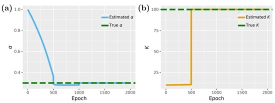 Finally, in Figure 10, we show results for the inverse problem for the SIR model, where we estimate the two parameters, and . As one can see from Figure 10a,b, both parameters converge to the true parameter values, however, again, only after escaping from local minima (see epochs 5000 to 7500 for and epochs 2500 to 7000 for ).