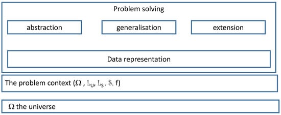 The higher level cognitive processes are based on the proper representation of a limited part of the word (c.f. [5]), abstraction, generalization and extension, which are the building blocks of modeling and decision-making. In that respect, we follow Holte’s [11]) approach. In all problem-solving tasks, we should have a well-defined universe ; is the set of known universal laws, contains the task specific laws, constraints, is the set of all possible observations (features) of elements of , and f is the operator mapping from space of the solution functions to real values, basically the goal function of the task.