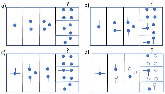 Let us demonstrate how the algorithm described above works in this logic problem. First, we characterize the base set. In example (a), we see dots, so the characterization of the base set is dot, dot–dot, dot–dot–dot, respectively. It already contains some abstraction since the relative positions of the dots are not listed. The next level of abstraction is that we introduce the number of dots, and we abstract it as . Then comes the task that we should continue this series according to some rule(s). So, we need to filter out some laws from the examples given. It is clear in this case: for , where is the number of the dots in the i-th slot. We generalize this rule to any i. This means that we assume , which results in . This is the solution of the task in the abstract space. We now pull back the solution to the original space; this means then dot–dot–dot-dot in some arrangement. And, indeed, we find that there is an image corresponding to this description. Mission completed.