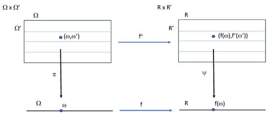We have a function describing different tasks, depending on R (e.g., for clustering, R is a finite set, for transformations, and, for a law, R is true or false). We may expect that some invariance is satisfied by f, i.e., there is a map, which is not a bijection; for that, in the appropriate domain. We may have no meaningful extension of f to the full . Our expectation towards the extension is that on , our extended function keeps the properties of the original f. Moreover, it shall be the same in the original domain. Formally, if is the projection of onto and is that of onto R, then for all