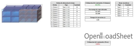 Figure 2 shows the home screen of the DSS, in which the parameters relevant to the container, boxes, and customers are entered. In Figure 3, the results are visualized. This figure shows relevant indicators, such as the percentage of the volume occupied, container weight, number of boxes placed, the order and rotation of these boxes, and the corresponding customer information.