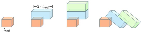 For instance, in case A1, using a container length of units along the X-axis, the first virtual wall () is placed at , as presented in Table 2 by [26]. This implies that the four boxes belonging to Customer 1 occupy only two units of length, a scenario achievable exclusively by allowing overhang. However, repeated overhangs cannot ensure vertical stability, this concept is illustrated graphically in Figure 5. Figure 5 demonstrates that a blue box placed atop a red box will remain stable, provided that less than 50% of its base is overhanging. Nevertheless, typical overhang models often do not validate stability for second-level placements. For instance, if a green box is placed on top of the blue box, both will collapse due to their center of gravity extending beyond the stable limits.