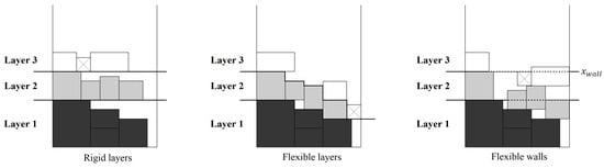 For comparison purposes, we introduced a relaxation of the virtual walls by allowing boxes from a customer scheduled to unload earlier to extend beyond their virtual wall by, at most, the length of the placed box (). This adjustment creates a “flexible wall”, which attempts to mimic—but does not precisely replicate—the flexible layers defined by [41], as their layers allow boxes to exceed the virtual wall by significantly more than just one box length. The right-hand side of Figure 6 illustrates this scenario clearly; the box labeled with an “X”, belonging to Customer 3, is located at coordinate along the X-axis. The virtual wall position for Customer 2 is at . The flexible layers from [41] permit scenarios where . Table 3 also illustrates the results obtained for MSRCA with flexible walls, demonstrating that the MSRCA heuristic can achieve results similar to those found in the literature when flexible walls are enabled.
