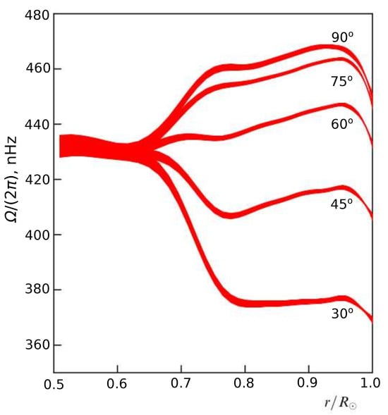 Distribution of the Sun’s differential rotation over the radial variable for different values [12].