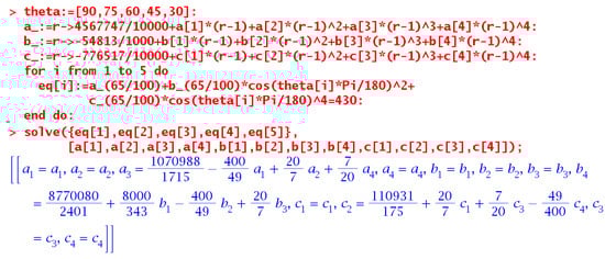 This system is underdetermined, since it contains five equations and 12 unknowns , , , . To obtain its general solution, we use the Maple package. The results are shown in Figure 2. In order to obtain a general solution, the numerical data are presented as rational fractions. It is evident that in the general solution there are nine free unknowns, i.e., in the system (24) there are actually only three independent equations.