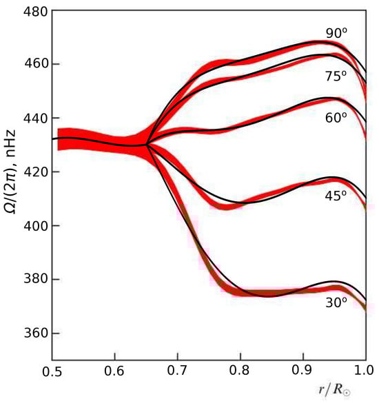 Model distribution of Sun’s angular velocity (thin lines). Distribution according to helioseismological data (thick red lines).