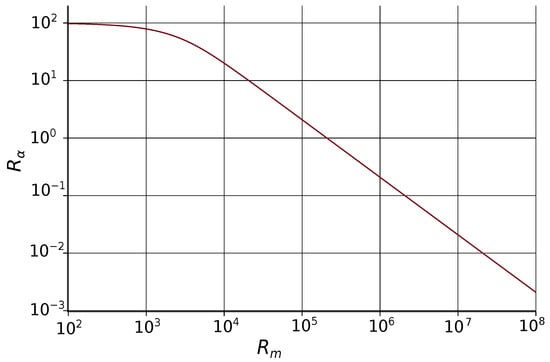 The following values are typical for the Sun dynamo: and [16,22]. We substitute the values and into Equation (Figure 4). As a result, we obtain the following value of the number . Now, we calculate other coefficient values for the system (17), in particular the values