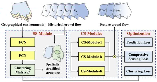 Figure 1 illustrates the framework of the proposed SCS-Net, which consists of a Spatially Stratified Module (SS-Module) and several Compressive Sensing Modules (CS-Modules). The SS-Module first clusters the spatial units based on their geographical environments to extract the spatially stratified structure. Then, for the spatial units in each cluster, a certain CS-Module compresses the redundant information in the historical crowd flow of the spatial units for efficient prediction. Finally, the parameters of SCS-Net are optimized through the prediction loss, the clustering loss, and the compressive sensing loss. We then aggregate the predictions of spatial units in different clusters to obtain the future crowd flow.