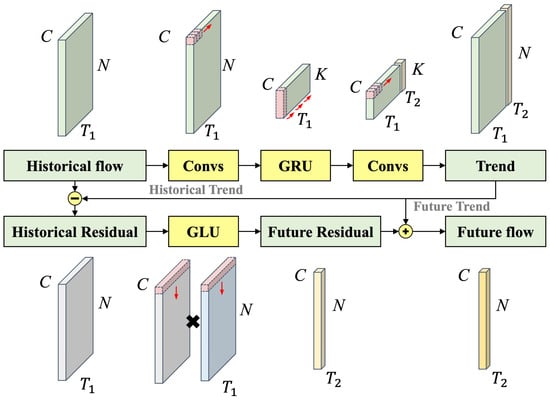 It is evident that the reconstructed crowd flow retains only the key trends while losing the details of the spatial units. To fully leverage the information in the crowd flow data for improving predictions, the residual learning step employs a Gated Linear Unit (GLU) to capture the fluctuation patterns of the residuals between the historical crowd flow and the trends and to predict the future residuals for each spatial unit. This process can be formulated as the following equation: