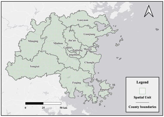 In this study, we conducted experiments on a large-scale real-world dataset, the CrowdFZ dataset. This dataset is derived from Android device location data in Fuzhou, China, provided through a collaboration with Chinese telecom operators. The data have a population sampling rate of approximately 20%, with a random sampling process, and each record finely reflects a user’s location. Therefore, we believe that this dataset is sufficiently capable of representing large-scale real-world crowd movements. Based on this, we divided Fuzhou into grids with a spatial resolution of 0.01 degrees in both latitude and longitude, resulting in a total of 11,418 spatial units, as shown in Figure 3. We then aggregated the inflow and outflow within each grid at 30 min intervals from 1 January 2023 to 28 February 2023 to construct the CrowdFZ dataset.