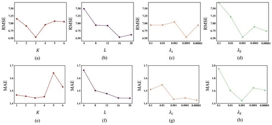 Results of the parameter sensitivity analysis. (a–d) RMSE of SCS-Net under different hyperparameter configurations. (e–h) MAE of SCS-Net under different hyperparameter configurations.