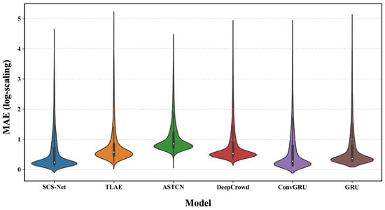 MAE distributions of SCS-Net, TLAE, ASTCN, DeepCrowd, ConvGRU, and GRU after log-scaling. For each column, the outer curve illustrates the probability density distribution, the thick black bar in the center represents the interquartile range (IQR), the thin black lines extending from it denote the 95% confidence interval, and the white dot indicates the median.