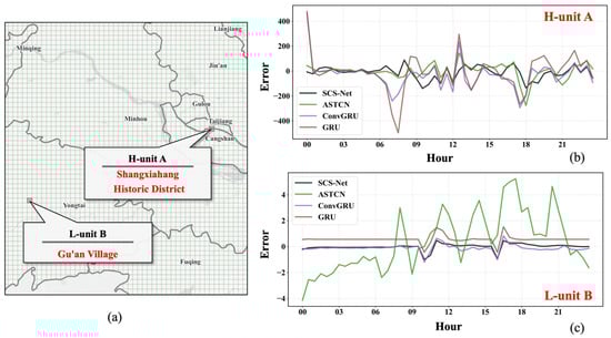 Additionally, we visualized the prediction errors of an H-unit and an L-unit on 24 February 2023 (Figure 6). To maintain readability, we selected four representative models for comparison. H-unit A corresponds to Shangxiahang Historic District, a major tourist and commercial area in Fuzhou, while L-unit B corresponds to Gu’an Village, a small rural village in Fuzhou. The results show that ConvGRU and GRU exhibit larger error fluctuations in H-unit A, whereas their errors remain relatively stable in L-unit B. In contrast, ASTCN exhibits the opposite trend, further validating our understanding of this anomaly. Moreover, as shown in Figure 6, SCS-Net effectively captures the significant differences in crowd flow patterns between spatial units A and B, demonstrating its capability to handle spatial heterogeneity. As a result, it achieves the best overall performance.