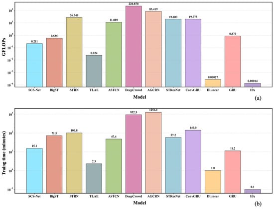 To evaluate the efficiency of our proposed SCS-Net and the baseline models for large-scale crowd flow prediction, we introduced Giga Floating-Point Operations (GFLOPs) and training time (minutes) as evaluation metrics to assess model efficiency. The GFLOPs measures the total number of floating-point operations performed by the model per batch (batch size = 1). The training time reflects the actual time required for the models to converge during training. The efficiency comparison results are shown in Figure 7. Overall, the GFLOPs and the training time are correlated. SCS-Net significantly outperforms most baseline models. Although the GFLOPs and training time of HA and DLinear are considerably lower than that of SCS-Net, the poor predictive performance of these two linear time series prediction models limits their application to large-scale crowd flow prediction tasks. Meanwhile, TLAE also has lower GFLOPs and training time and achieves relatively good accuracy. However, when SCS-Net is deployable, it remains the better choice. In contrast, the CNN, GNN, and attention-based spatio-temporal prediction models have GFLOPs approximately 53 (ASTCN) to 1067 (DeepCrowd) times higher than SCS-Net and training times that are about 3.1 times (ASTCN) to 83.2 times (AGCRN) longer, leading to substantially higher costs. Considering that SCS-Net is not constrained by prior graph structures, nor by the shape or distribution of spatial units, this demonstrates its superior applicability to large-scale crowd flow prediction.
