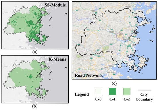Comparison of clustering results between K-means and the SS-Module. (a) Spatial distribution of clusters produced by K-means. (b) Spatial distribution of clusters produced by the SS-Module. (c) Actual road network of Fuzhou. In the legend, “C-0”, “C-1”, and “C-2” represent Cluster 0, Cluster 1, and Cluster 2 in both clustering results, respectively.