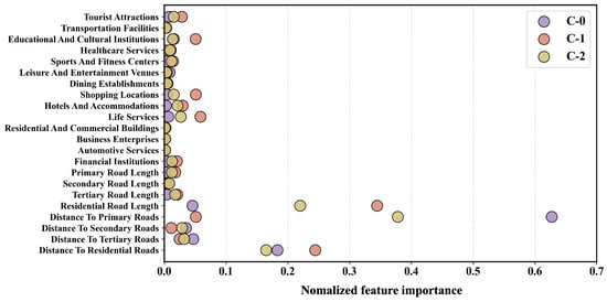 To further investigate which external factors play a key role in identifying the spatially stratified structure, we built regression models using the random forest algorithm to relate the external factors to each cluster from the SS-Module. We then visualized the distribution of normalized feature importances for these clusters, as shown in Figure 9. Overall, road network-related factors dominate the feature importance across all three clusters. Specifically, distance to primary roads, distance to residential roads, and residential road length are critical for identifying C-0 and C-2, likely reflecting proximity to built-up areas. In contrast, identifying C-1, which represents built-up areas, requires considering more factors, including residential road length, distance to residential roads, distance to primary roads, life services, shopping locations, educational and cultural institutions, and tourist attractions. These factors are closely related to transport accessibility and diverse urban functions, offering potential value for urban spatial planning in Fuzhou. The prior K-means clustering fails to capture the complex relationships between crowd flow and these factors, thereby limiting its ability to improve prediction performance.