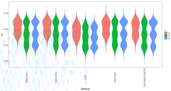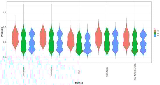 The dataset does not have missing cells, and the diabetes rate is about 34.9% in this dataset. Please note that the dataset in this study is different from the one in Xin et al. [4]. They used the data “PimaIndiansDiabetes2” in the package mlbench, and we use the data “PimaIndiansDiabetes” in the package mlbench. Moreover, we do not use the second logistic model in this study. Hence, the estimation results cannot be compared with the results that were obtained by Xin et al. [4]. In this section, the 5-fold cross-validation method (K = 5) is used to assess the quality of the models. In Section 3, we already mentioned that PSO-NAG could help to save computation time with good performance. In this section, we use the PSO, PSO-Mom, PSO-NAG, and PSO-NAG-SMOTE methods for the modeling of the Pima Indian diabetes dataset. PSO-Mom means that the is estimated based on the median of 100 PSO estimates of the , and then GDM-Mon is used to update parameter by replacing with the PSO estimate. For simplicity, we denote the PSO estimate of by -PSO. The parameter settings for the PSO and SMOTE methods are the same as those given in Section 3.