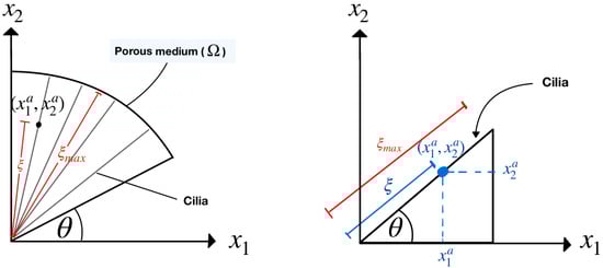 Figure 2 illustrates a rectangular porous domain composed of cilia that make an angle with the horizontal plane. In fact, the angle and the porosity should be varied in the numerical domain because of the metachronal waves of cilia. Unlike the other researchers, in this work, we define the numerical domain in the shape of a fan blade, resembling the wave pattern of cilia, as shown on the left side of Figure 3, where the cilia are monitored as rigid cylinders because they have long and thin lines. Based on our information, this shape of the domain was not studied in the previous literature. The model designed is more closely to the actual beating pattern of cilia in that the cilia rotate as a clockwise pattern moving from left to right around their base. The movement of cilia generates the leftward flow of the PCL fluid. Figure 3 on the left shows our numerical porous domain with the angular movement of the cilia. The angle represents the angle that the cilia make with the horizontal plane. In previous research, scholars have not studied various angles, , in one fixed numerical domain. They considered only one angle, , for one fixed numerical domain. Notice that there are numerous angles, , in our one fixed numerical domain. Since there are several angles, , in the domain, the porosity cannot be used as a constant. So, the porosity in this work is considered a function of the angle, , not a constant. The variable is the dimensionless length along cilia, which is the distance from the roots of the cilia to a point on the cilia divided by the length of the cilia, which is approximately 7.5 µm [32]. Figure 3 on the right shows that, at each point on the cilia, we can calculate the variable using the formula and the angle , and the variable represents the dimensionless length of the cilia, which is one. Because we consider the movement of bundles of cilia affecting the movement of the PCL fluid, we use the generalized Brinkman equation [33] on a macroscopic scale to predict the velocity of the PCL fluid in the porous medium. The mathematical model we use is derived in [33], which is a macroscale equation determined from an upscaling technique called Hybrid Mixture Theory (HMT) [34,35,36] and the nondimensionalization method. This model is more general than the Brinkman equation in the literature because we choose to use the equation that the porosity in this equation is considered as a function since the beginning of the derivation starting from the conservation of momentum. The generalized Brinkman equation is not only derived in [33] but the authors have also proved the existence and uniqueness of the numerical solution when the equation is applied via a mixed finite element method. In [33], the authors used the Lax–Milgram theorem to prove the well-posedness of the equation. To the author’s knowledge, the generalized Brinkman equation was not solved numerically in any literature before. It is solved for the first time in this work. The aim of this research is to determine the velocity of the PCL fluid in the fan-blade shape of the porous domain using the generalized Brinkman equation, in which the fluid is driven by the beating of cilia.