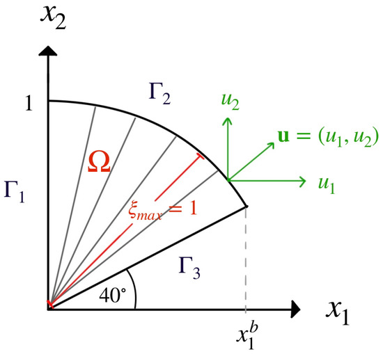 Before we provide our numerical results, we first validate our numerical solutions using the discretized model provided in Section 3, Equation (39). For this validation, we begin with the two-dimensional numerical domain, as shown in Figure 4. The domain is in the shape of a portion of a quarter circle. After that, we apply the mesh generator Netgen [43] to generate a triangular mesh, as shown in Figure 7. Figure 7 shows the example of our generated mesh with 5 degrees apart. To validate the numerical result, we use four different mesh refinements. The four discretized domains consist of , and 704 elements. For the constant variables, we let g/(μm·s), g/μm3, the gravity μm/s2, and the coefficient values in Equation (14). For the shape functions, we use quadratic triangular elements for the velocity and linear triangular elements for the pressure, confirming the stability of the method known as the Taylor–Hood elements [44]. Therefore, in Equations (28) and (29), , and . Next, we clarify the value of the inverse of the permeability tensor, , used in our program. Because the polynomial function (40) used to approximate the permeability tensor is the function that depends on , for each where , we have six values per element. In this work, for each element, we average the 6 values of each and use the average value of each to find the numerical solutions. We then compute the inverse of the matrix to obtain for each element.