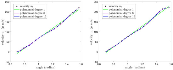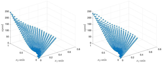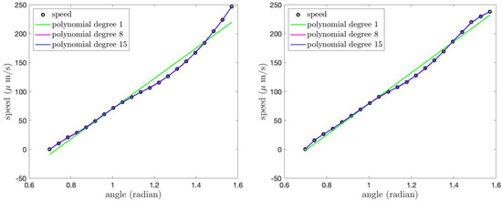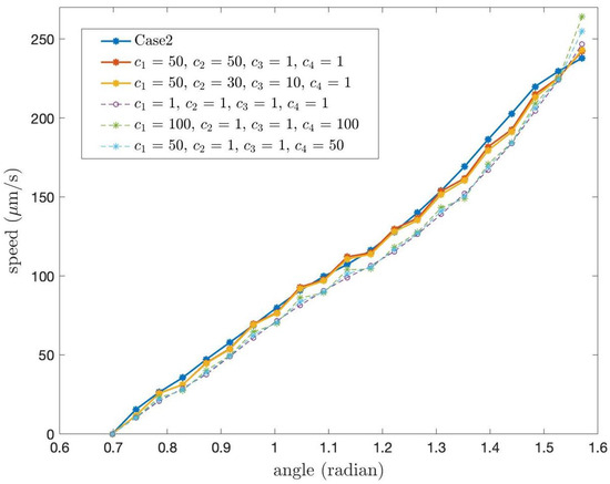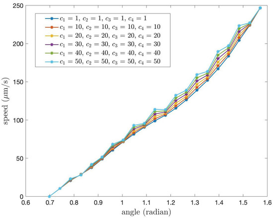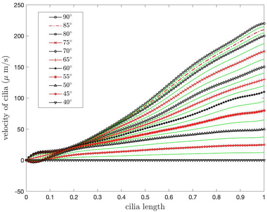 From [39], they experimentally provide that, for the forward stroke of cilia, the cilia stop beating at , approximately. In this research, we assume the cilia start at , move forward with a decreasing angle, and stop beating at . Because the angles used in this study are 5 degrees apart, we determine the cilia speed at the angles by averaging the cilia speed of two adjacent angles. For example, we calculate the cilia speed at by averaging the cilia speed at and . We provide the coefficients of Equation (43) at and in Table 1, and the speed profiles of the angles are represented in Figure 6. Table 1 illustrates the coefficients of the terms of the polynomial in Equation (43), which are not provided in [25]. Figure 6 illustrates the speed along cilia from the roots to the tips of cilia from the angle to . The black line is the velocity at and presented in [25], and the red line is the speed at and , and also, we show the speed at , as illustrated by the green line. The speed of the cilia is the maximum at the angle , and the speed is reduced when the angle decreases until the cilia speed equals zero at .