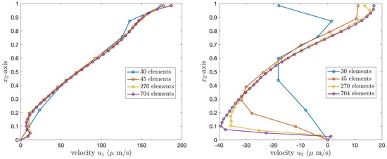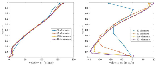To validate the code, we choose to present the velocity profile of the PCL fluid when . Since, in our work, we consider two cases of the boundary conditions, we provide our numerical results for the two cases. Figure 8 and Figure 9 illustrate the PCL velocities for Case 1 and Case 2 boundary conditions, respectively. In both figures, the left graph shows the velocity, , and the right graph presents . The blue, orange, yellow, and purple lines represent the velocity of the PCL fluid obtained from the grid refinements containing 30, 45, 270, and 704 elements, respectively. In both figures, the numerical solutions obtained from the coarser grids converge to the numerical solutions obtained from the finest grid. Table 2 presents the norm errors of the velocities and of the PCL fluid at the angle , compared to the solutions obtained from the finest grid, 704 elements. The results show that the errors decrease as the number of elements increases, illustrating the convergence of the numerical solutions.