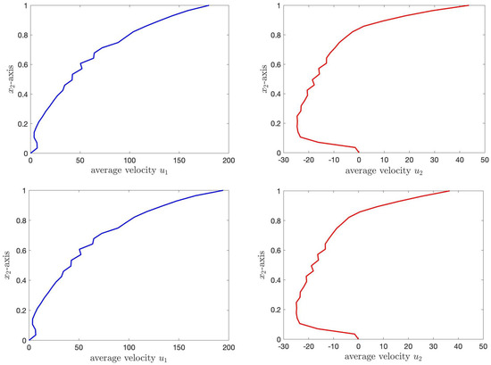 The velocities of the PCL fluid obtained from four different mesh refinements at the angle for the Case 2 boundary condition. The left graph is the velocity , while the right graph is the velocity .