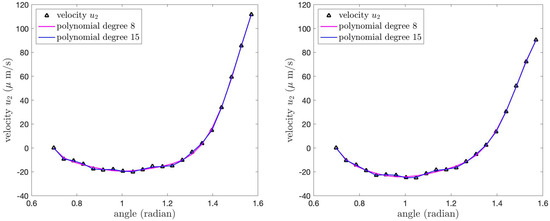 We provide the solid velocity used in this study employed from [25,39]. In [39], the authors experimentally provide the speed of cilia in lungs when cilia make angles to approximately with the horizontal plane. Next, Wuttanachamsri and Schreyer [25] convert the cilia speed into a polynomial form. The solid speed is approximated in the form of the eighth-order polynomial functions where the coefficients for the angles and are given in Table 1 in [25]. That is the speed of cilia