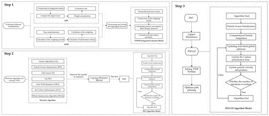 Choosing the optimal path in planning is a complex task due to the numerous options and constraints; this is known as the trip design problem (TTDP). This study aims to achieve path optimization through the weighted sum method and multi-criteria decision analysis. Firstly, this paper proposes a weighted sum optimization method using a comprehensive evaluation model to address TTDP, a complex multi-objective optimization problem. The goal of the research is to balance experience, cost, and efficiency by using the Analytic Hierarchy Process (AHP) and Entropy Weight Method (EWM) to assign subjective and objective weights to indicators such as ratings, duration, and costs. These weights are optimized using the Lagrange multiplier method and integrated into the Technique for Order Preference by Similarity to Ideal Solution (TOPSIS) model. Additionally, a weighted sum optimization method within the Traveling Salesman Problem (TSP) framework is used to maximize ratings while minimizing costs and distances. Secondly, this study compares seven heuristic algorithms—the genetic algorithm (GA), particle swarm optimization (PSO), the tabu search (TS), genetic-particle swarm optimization (GA-PSO), the gray wolf optimizer (GWO), and ant colony optimization (ACO)—to solve the TOPSIS model, with GA-PSO performing the best. The study then introduces the Lagrange multiplier method to the algorithms, improving the solution quality of all seven heuristic algorithms, with an average solution quality improvement of 112.5% (from 0.16 to 0.34). The PSO algorithm achieves the best solution quality. Based on this, the study introduces a new variant of PSO, namely PSO with Laplace disturbance (PSO-LD), which incorporates a dynamic adaptive Laplace perturbation term to enhance global search capabilities, improving stability and convergence speed. The experimental results show that PSO-LD outperforms the baseline PSO and other algorithms, achieving higher solution quality and faster convergence speed. The Wilcoxon signed-rank test confirms significant statistical differences among the algorithms. This study provides an effective method for experience-oriented path optimization and offers insights into algorithm selection for complex TTDP problems.