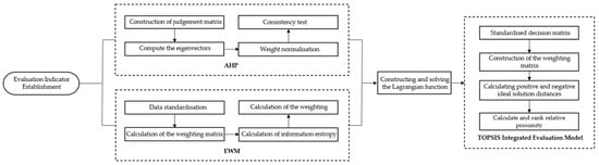 This section provides a comprehensive overview of the structure of the TOPSIS comprehensive evaluation model (Section 3.1). Additionally, it introduces the AHP (Section 3.2), EWM (Section 3.3), and the Lagrange multiplier method (Section 3.4). Section 3.5 then elaborates on the integration of these methods into the proposed TOPSIS comprehensive evaluation model.