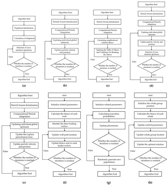 Flowcharts of the five heuristic algorithms: (a) genetic algorithm; (b) particle swarm optimization algorithm; (c) tabu search algorithm; (d) genetic-particle swarm algorithm; (e) particle swarm Laplace disturbance algorithm; (f) gray wolf optimizer; (g) ant colony optimization; (h) whale optimization algorithm.