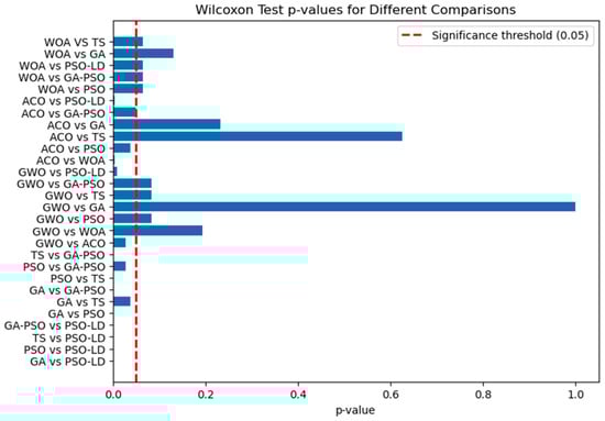 In this study, to ensure a fair comparison, the performances of GA, PSO, TS, GA-PSO, PSO-LD, GWO, ACO, and WOA were evaluated using identical parameter settings, including population size and the number of iterations. These settings are listed in Table 5.
