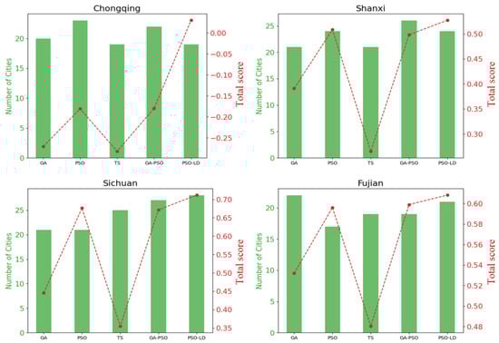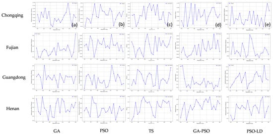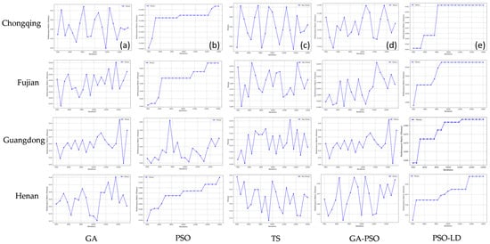 As shown in Table 11, each algorithm has distinct features and is suited to different types of optimization problems. For example, GA is highly effective for large-scale optimization problems, while PSO excels in continuous optimization and is quicker to converge compared to TS, which is better at avoiding local optima. PSO-LD, with its integration of a dynamic Laplace perturbation, outperforms the others, achieving the best overall results in most regions due to its enhanced global exploration and faster convergence. This algorithm’s superior performance underscores its effectiveness in solving the TTDP under complex constraints.