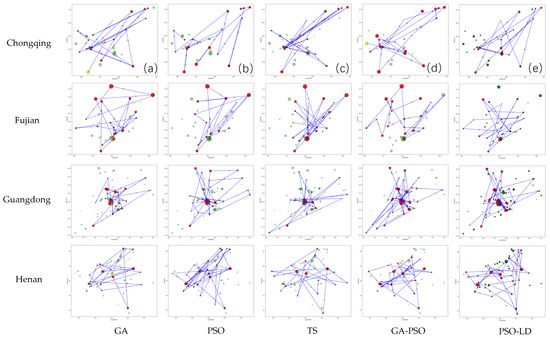 Path planning maps for Yunnan, Beijing, Hubei, Liaoning, Shaanxi, and Sichuan by using different heuristic algorithms. Introduction of to each section: (a) GA; (b) PSO; (c) TS; (d) GA-PSO; (e) PSO-LD.