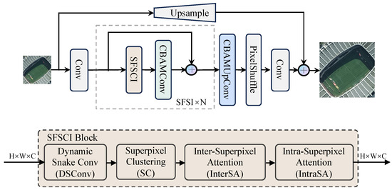 As depicted in Figure 2, SFSIN follows a three-phase design: (1) Morphological feature extraction captures low-level edges and corners; (2) SFSI blocks iteratively aggregate strip-like features through DSConv and superpixel attention; (3) CBAMUpConv reconstructs HR images by fusing multi-scale attentive features. This hierarchical approach ensures progressive refinement from local details to global structures.
