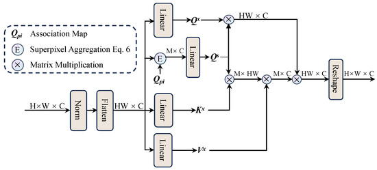 Specifically, the feature map is first divided into a regular grid and superpixels are initialized into , where M denotes the number of superpixels. Given a pixel (note that is the number of pixels), it belongs to one of the M superpixels. The relationship between pixels and superpixels is then iteratively refined through soft associations.