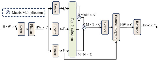 It then calculates the relationships between these selected pixels within the superpixel using the self-attention mechanism defined by Equations (7) and (8). The calculated pixels are then distributed again to their respective positions in the image. While top-N selection alleviates the problems mentioned above, it also means that some similar pixels within a superpixel may not be considered. Therefore, we use the value key to capture all features before the pixel attention operation and integrate them back into the original image with distributed pixels.