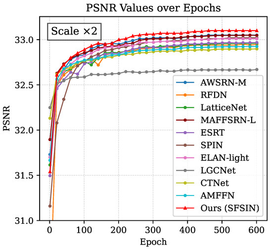 It is worth noting that, on the scale, SFSIN-S slightly outperforms SFSIN in terms of PSNR, which is likely due to its better generalization and efficiency in handling larger upsampling factors.