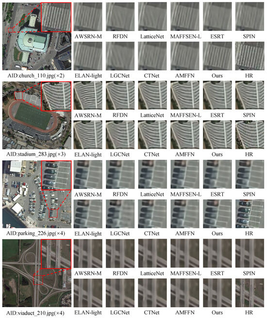 In addition to quantitative improvements, our SFSIN model excels in the quality of visual reconstruction, especially in demanding remote sensing scenarios. In Figure 7, SFSIN demonstrates its ability to preserve thin structures that are often blurred or distorted by methods such as RFDN and LatticeNet. For clarity, the red box highlights correspond to the HR images.