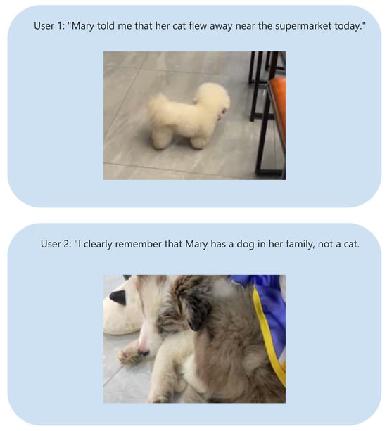 The research on the content features of rumor detection mainly focuses on the following two modalities: text and image. A specific scenario (as shown in Figure 1) is selected for analysis. The content features of the text are divided into two aspects. One is the semantic features of text entities. For example, in the text of User 1, the entities “Mary” and “cat” represent roles, the entity “supermarket” represents a location, and “fly away” represents an event. The other is the logical features of the text. From the perspective of a single text, it is the concatenation relationship between entities. “Mary’s cat flew away near the supermarket” represents the logical relationship of a role having an event occur at a specific place. At the same time, the logical features of the text also include the correctness of the relationship between entities. According to the statement of User 1 and combined with the actual situation, a “cat” cannot act “flying away”. In the process of feature extraction by the model, this is manifested as the distance between entities in the dictionary. The closer the distance, the stronger the correlation. Through a comprehensive analysis combined with tweet comments, the text of User 2 mentions a new entity “dog”, which has a logical conflict with the statement of User 1, that is, the logical features of the text context. Finally, by combining the two modalities of text and image, the entity in the text of User 1 is a “cat”, but in the image, it is a small dog. The inconsistency between the text and the image is a logical feature between the text and the image.
