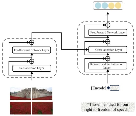 The characteristics of rumor content include semantic features and require learning of logical features. In the text–image multimodal environment, there are logical relationships between words within the text and logical errors such as self-contradictions and mismatches between text and images. Moreover, extracting the logical features of rumor content from previous studies is considered a single perspective. It did not profoundly explore the logical features within and between the text and the image. This paper designs a text–image multimodal logical connection feature extraction module to deeply learn the text–image logical connections and extract multimodal logical features. Visual information is injected by inserting an additional cross-attention (CA) layer between the bidirectional self-attention (Bi-SA) layer and the feed-forward network (FFN) layer of the text logical feature encoder. Finally, the output features are used as the multimodal representation of the text–image logical connection features. The specific structure is shown in Figure 4.