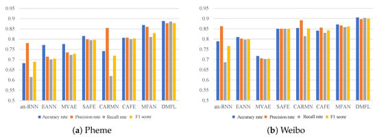 In conclusion, the DMFL’s dual-chain learning fuses the multi-level text features, the text–image logical connection multimodal features that connect text and images, and the text–image basic semantic multimodal features for rumor detection, and it performs better on both datasets.