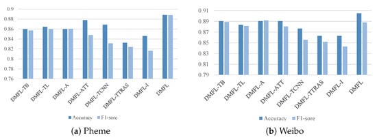 Table 4 and Figure 6 show the performance comparison between the seven variants of DMFL and the original DMFL on the Pheme and Weibo datasets. The experiments prove that the accuracy and F1-score values of the DMFL algorithm model are higher than those of all DMFL variants. The four main modules of DMFL, namely, the multimodal semantic feature extraction module, the multimodal logical feature extraction module, the modality alignment module, and the cross-modal cross-attention mechanism, are all reasonable and effective and positively impact the model performance.