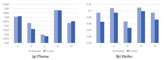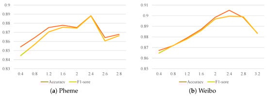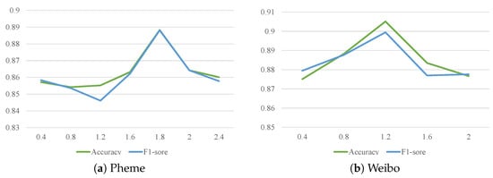 is used to adjust the weight of the classification loss. The value of is increased with a step size of 0.4 for experiments to find the range of values with the best performance. Then, the step size is reduced for further experiments to find the optimal value for the best performance. As can be seen from Figure 7, the overall influence of the classification coefficient on the model performance shows a trend of first increasing and then decreasing, and the performance differences on the two datasets are relatively small, which proves that the performance of the classification task on the two datasets has little difference. The optimal value of is 1.8 on the Pheme dataset and 1.2 on the Weibo dataset.